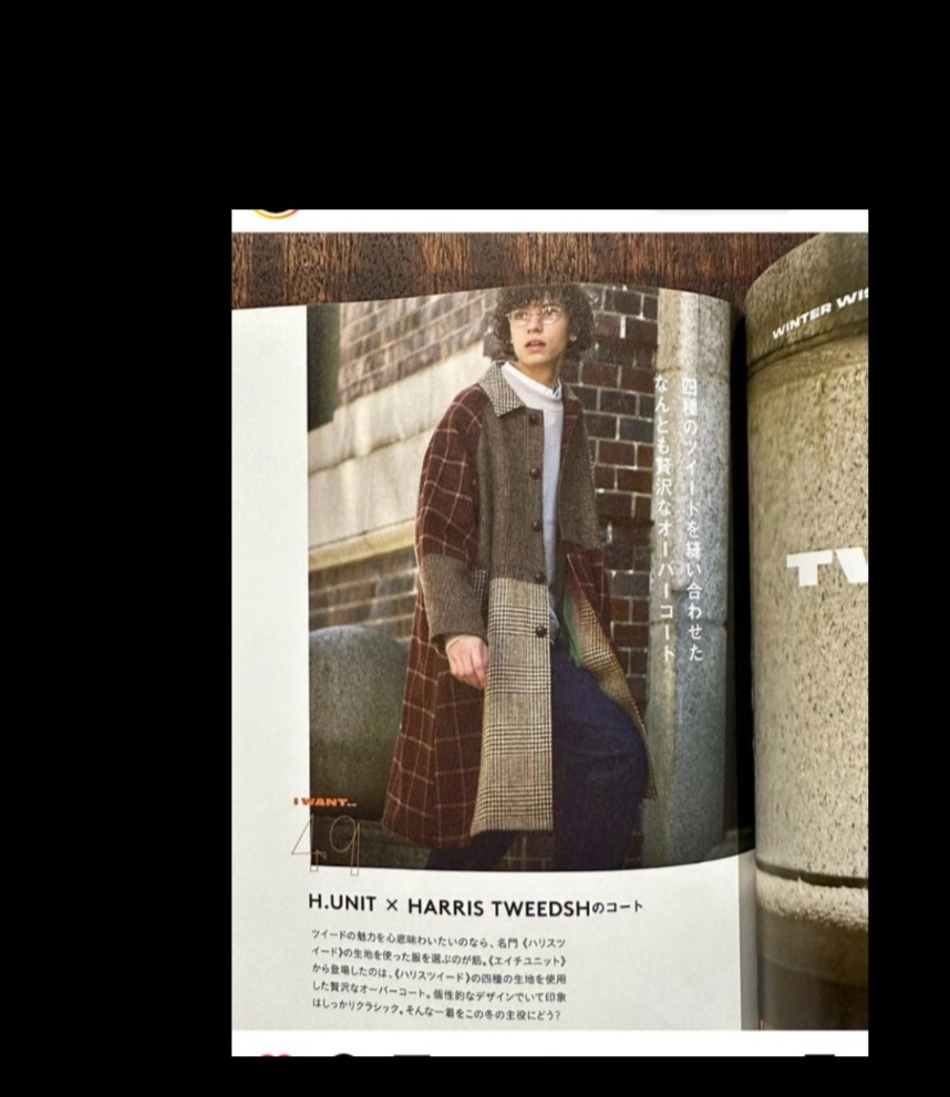 ようやく肌寒くなってきたように思います。もう11月ですからね。そろそろアウターの出番ですかね。写真はmensFUDGE12月号になります。当店で取り扱っているブランドが何点か掲載されていたのでご紹介します。H.UNITのHARRIS TWEEDのswitchingcoatです。あの、ハリスツイードの四種の生地を使用してつくられた贅沢なオーバーコートです。雑誌ではこのオーバーコートのみ掲載されていますが、ジャケットタイプもあります。ご興味ある方は是非ご来店くださいね。